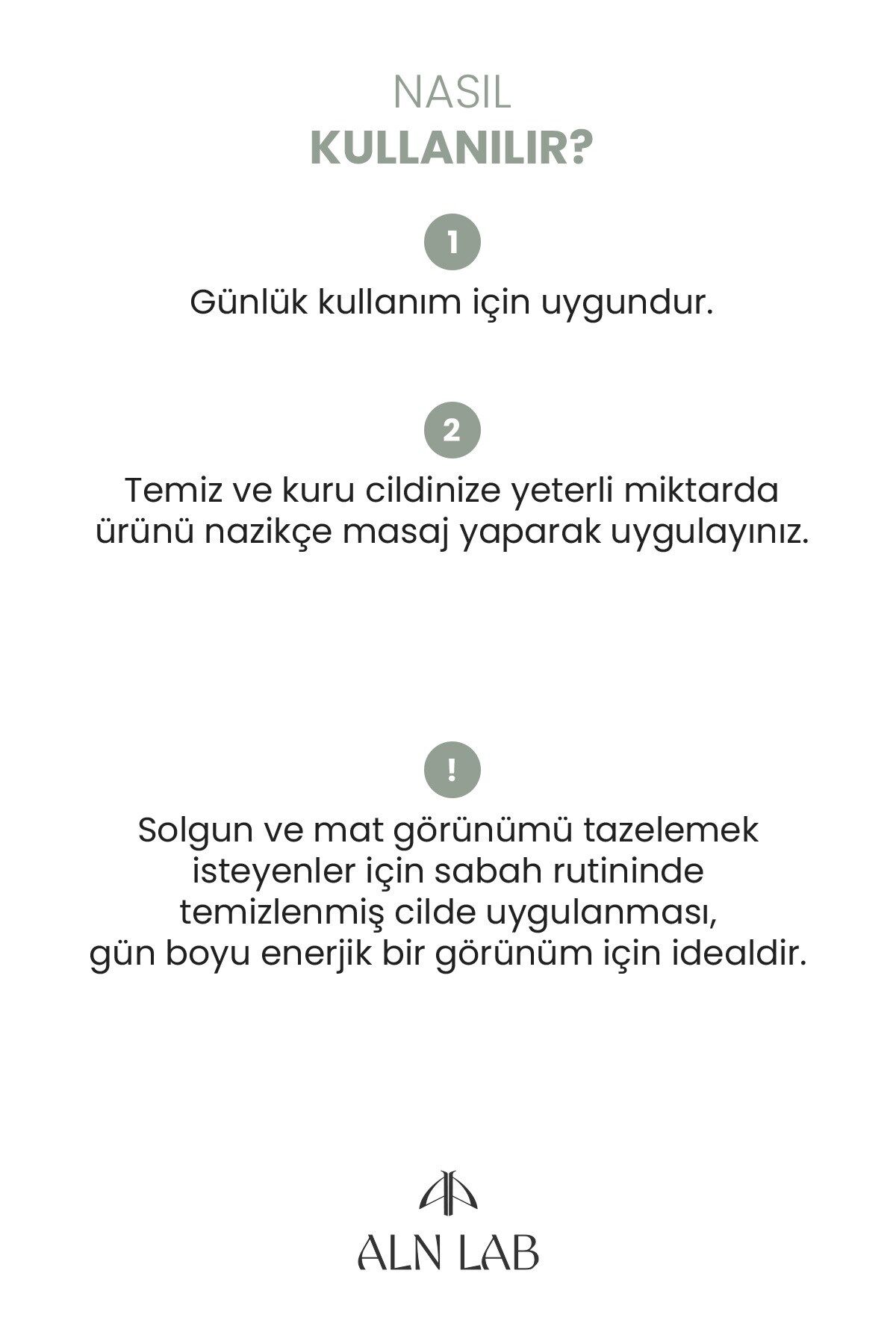 Hekim Kullanım Notu: Solgun ve mat görünümü tazelemek isteyenler için sabah rutininde temizlenmiş cilde uygulanması, gün boyu enerjik bir görünüm için idealdir.