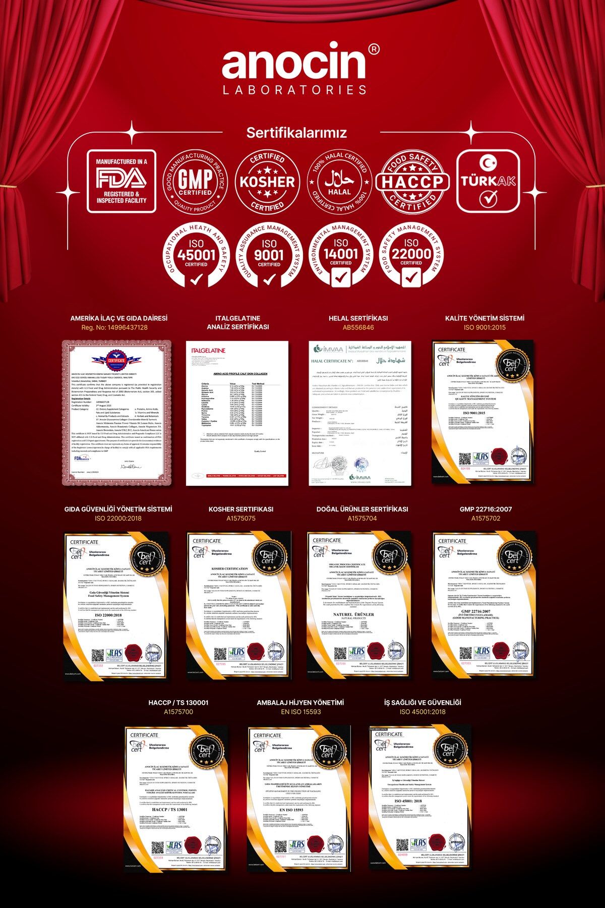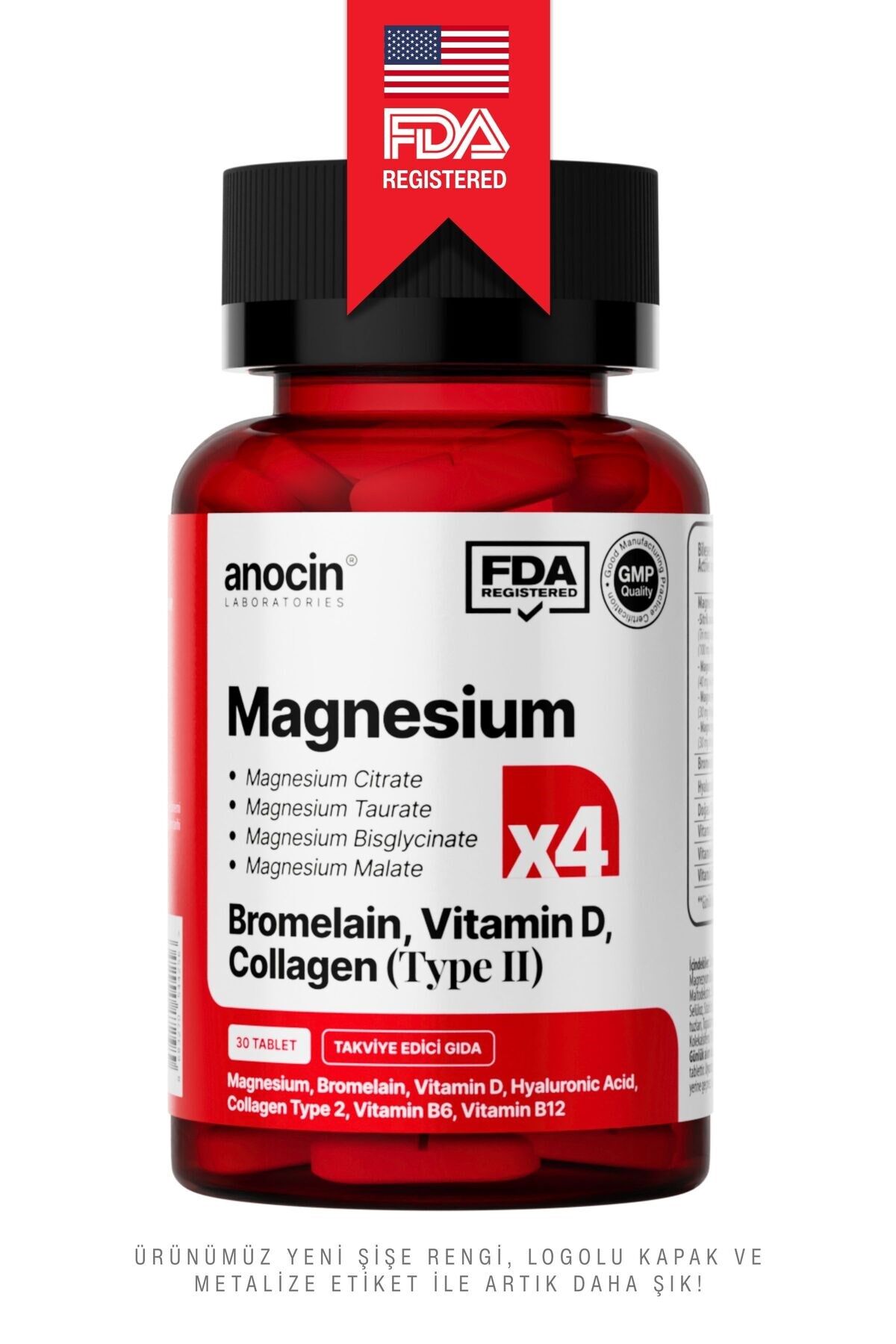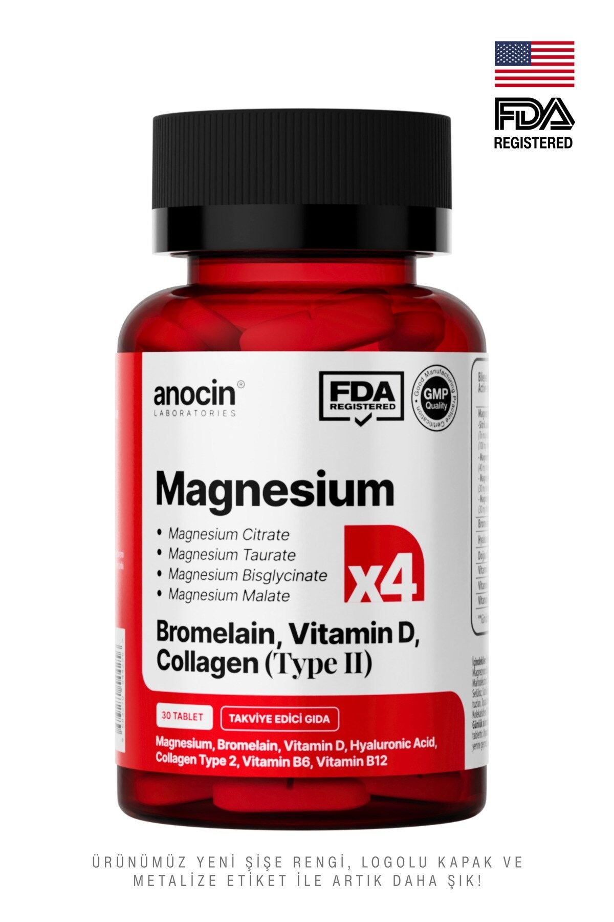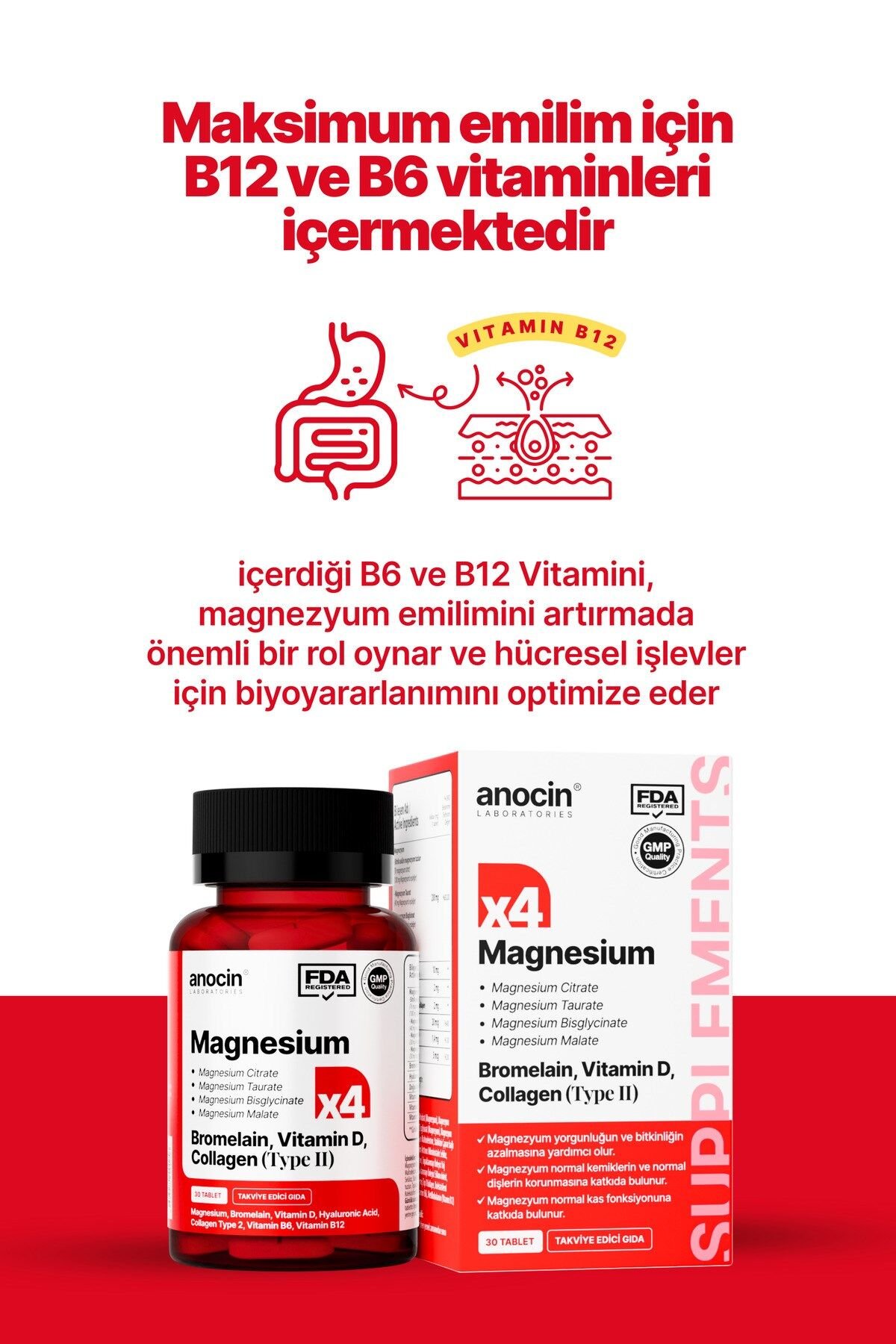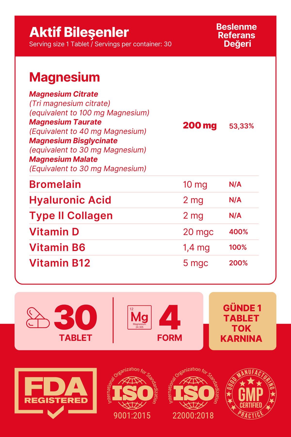- Magnezyum X4 Kompleks, Citrate, Taurate, Bisglisinat, Malat, Bromelain, Kolajen, H.; ASİT, D+B12+B6 içeren bu multivitamin seti, günlük vitamin ihtiyacınızı karşılamak için idealdir.; - Her pakette bulunan 30 tablet sayesinde uzun süreli kullanım imkanı sunar ve düzenli takviye ihtiyacınızı karşılar.; - Aromasız formülü ile herhangi bir tat veya koku hissetmeden rahatça tüketebilirsiniz; böylece günlük rutininize kolayca entegre edebilirsiniz.; - Yetişkinler için özel olarak formüle edilmiş bu multivitamin takviyesi, sağlıklı yaşam tarzınızı desteklemek amacıyla tasarlanmıştır.; - Üretiminde yüksek kaliteli malzemeler kullanılarak üretilen bu ürün, içerik menşei ABD dir , Türkiye'de Helal sertifikalı tesislerde üretilmiş olup güvenle tüketebileceğiniz bir seçenektir.
