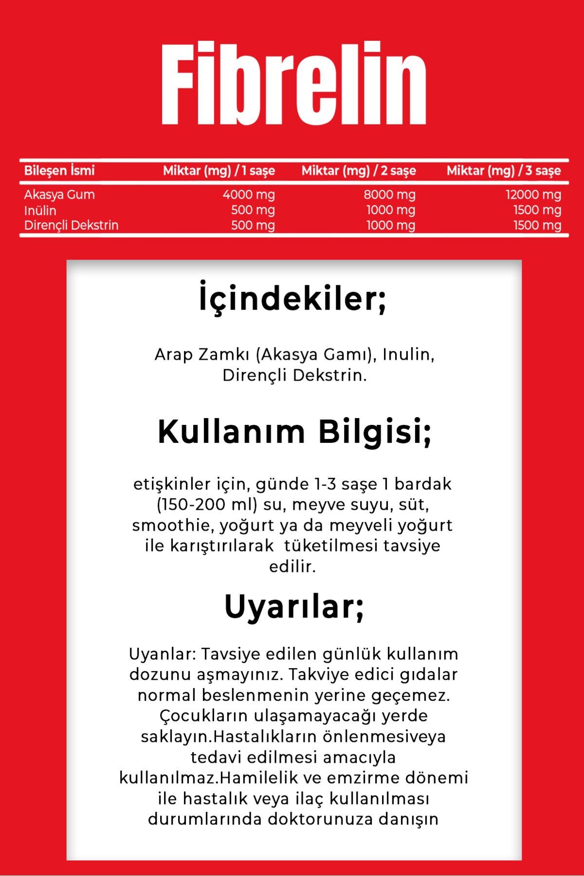 Bu üründen tek seferde en fazla 20 adet sipariş verilebilir.;Vitisfera Fibrelin her şase için arap zamkı ( akasya gum ): 4000 mg İnülin:500 mg dirençli dekstrin: 500 mg ;-Yüksek Saflıkta Etken Maddeler Akasya Gamı Fransa'nın Tescilli ve patentli akasya gum markası olan Nexira firmasından temin edilmektedir.;Kullanım şekli: Vitisfera Fibrelin 30 Şase yetişkinlerin kullanımına uygundur.;Hekim tarafından başka bir şekilde önerilmediği sürece yemekten sonra günde 1 kez 1 şase (Su-Çay-Yoğurt-Smootie-Kahve-süt) 30-60 saniye arası karıştırılarak içilmelidir.;Uyarılar Şeker, tuz, nişasta içermez.;Gluten, maya, buğday, soya ve süt ürünleri gibi potansiyel alerjenleri içermez.;Renklendirici, yapay aroma, tatlandırıcı ve koruyucular kullanılmamıştır.;Vegan ve vejetaryenler için uygundur.;15 gün içinde ücretsiz iade.