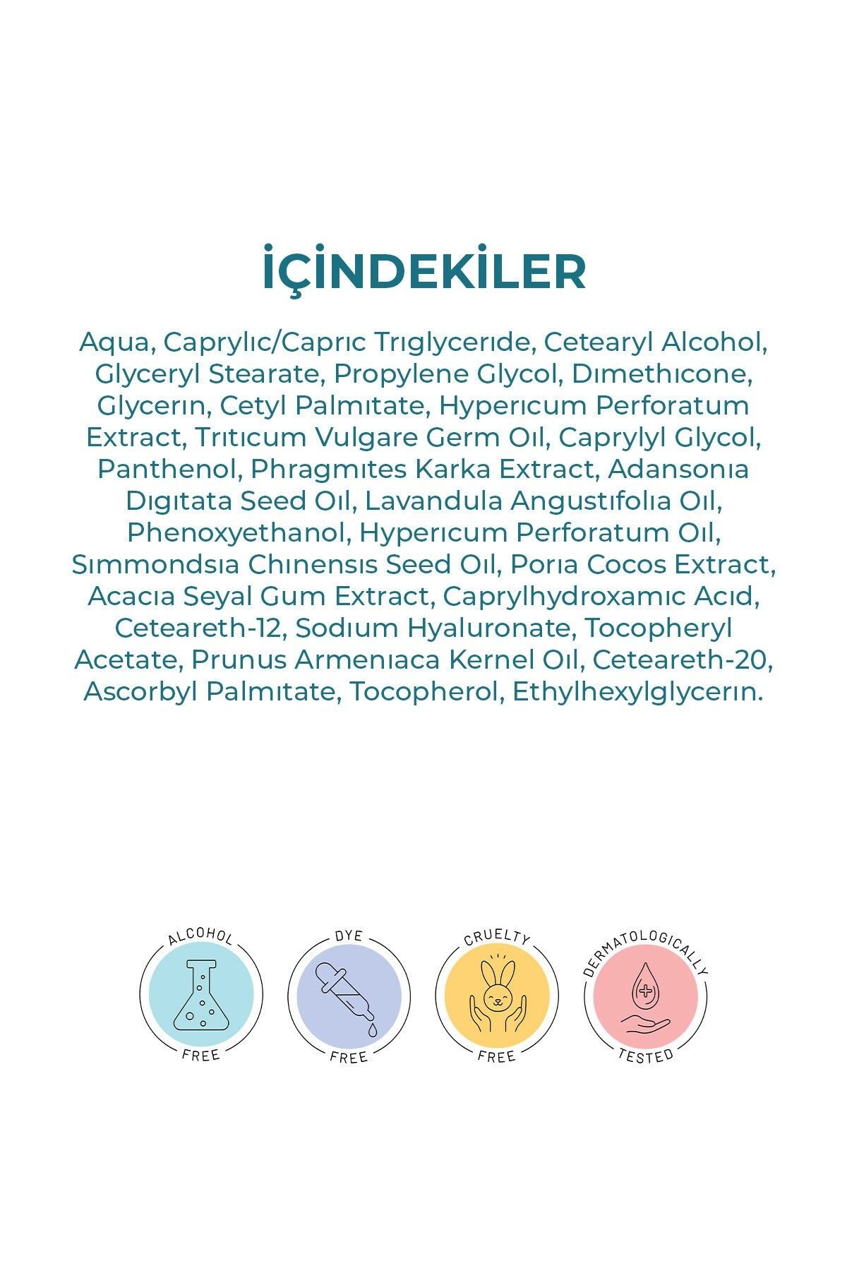 - İçindekiler Aqua, Caprylic/Capric Triglyceride, Cetearyl Alcohol, Glyceryl Stearate, Propylene Glycol, Dimethicone, Glycerin, Cetyl Palmitate, Hypericum Perforatum Extract, Triticum Vulgare Germ Oil, Caprylyl Glycol, Panthenol, Phragmites Karka Extract, Adansonia Digitata Seed Oil, Lavandula Angustifolia Oil, Phenoxyethanol, Hypericum Perforatum Oil, Simmondsia Chinensis Seed Oil, Poria Cocos Extract, Acacia Seyal Gum Extract, Caprylhydroxamic Acid, Ceteareth-12, Sodium Hyaluronate, Tocopheryl Acetate, Prunus Armeniaca Kernel Oil, Ceteareth-20, Ascorbyl Palmitate, Tocopherol, Ethylhexylglycerin.